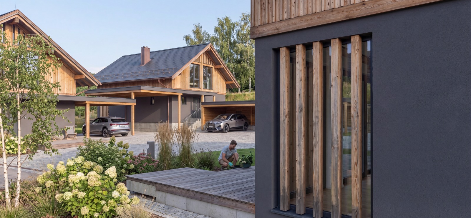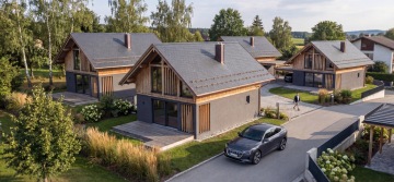 Projekt tvoří 4 samostatné domy v jednotném alpském stylu – moderní dřevostavby se sedlovou střechou a velkými prosklenými plochami. Každý dům má velkorysý společný prostor s kuchyní a obývacím pokojem, 5 ložnic, 2 koupelny, terasu a minimálně jedno kryté venkovní stání.