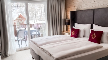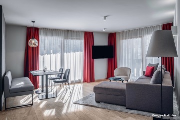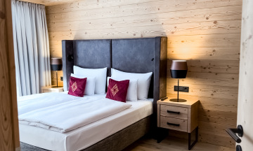 Interiéry jsou navržené jako moderní alpské útočiště pro krátké i delší pobyty: otevřená denní část s obývacím prostorem, jídelním stolem a plně vybavenou kuchyní, oddělené ložnice a promyšlená míra soukromí pro páry i rodiny. Standard cílí na prémiovou klientelu – důraz je kladen na kvalitní materiály, světlo a detaily, které obstojí i při intenzivním provozu a zároveň působí reprezentativně. Výrazným benefitem jsou prostorné balkony či terasy s výhledem do hor. Komfort podtrhuje i manželská postel velikosti king size v každém apartmánu.